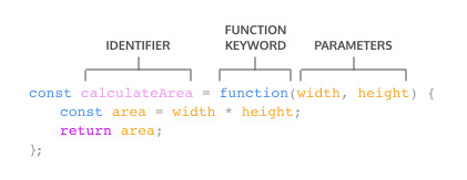 • function 키워드 뒤에 가능한 매개 변수가 있는 괄호 세트( )를 사용하여 생성된 익명 함수를 해당 변수의 값으로 할당한다. 그런 다음 중괄호 집합으로 함수 본문을 포함한다.