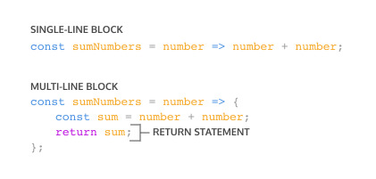 블록의 내용은 => 화살표 바로 뒤에 와야 하며 return 키워드는 제거 할 수 있다. 이를 암시적 반환이라고 한다 .